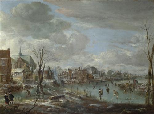 A Frozen River near a Village, with Golfers and Skaters