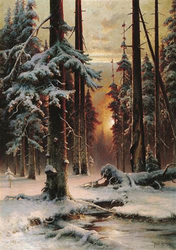 Зимний закат в еловом лесу