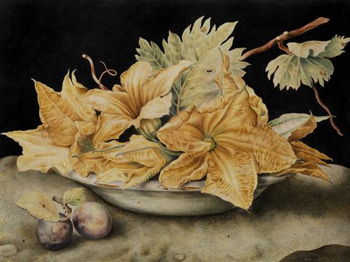 Still life with pumpkin flowers and vine leaves