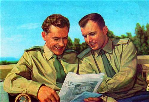 Герман Титов и Юрий Гагарин. Цветное фото (почтовая карточка, 1961 г.) - German Titov and Yuri Gagarin (postcard, 1961)