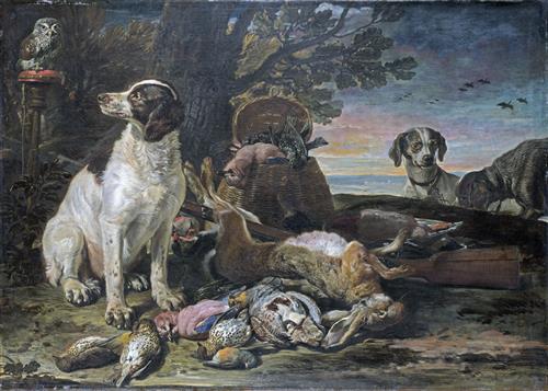 Мертвые птицы с ружьем, собаками и филином