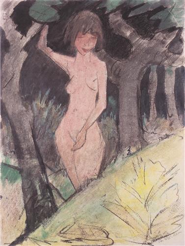 Zwischen Baumen stehendes Madchen