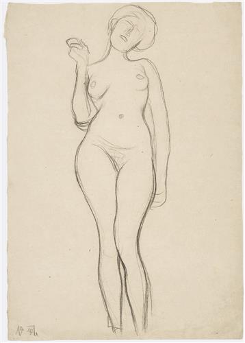 Standing female nude from the front with a raised right arm