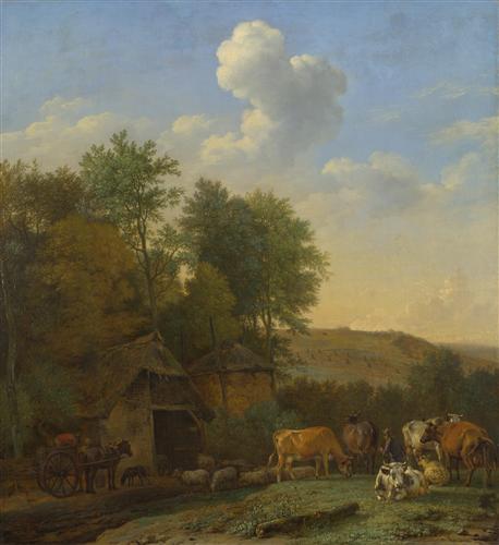 A Landscape with Cows, Sheep and Horses by a Barn